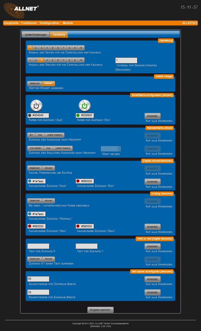 Quatre bornes à vis (2 pôles) sont disponibles pour le raccordement des consommateurs électriques à commuter. Chacune de ces interfaces peut être commutée individuellement. Les processus de commutation peuvent être exécutés manuellement ou programmés dans le temps. En outre, il peut être utilisé comme actionneur de commutation à distance par les solutions d\'automatisation ALLNET actuelles, comme par exemple ALL369x Powermeter, ALL3418v2, ALL3419, ALL3500, ALL3505, ALL4500, ALL5000, etc. \"voir à ce sujet la fonction ALLNET Remote\"