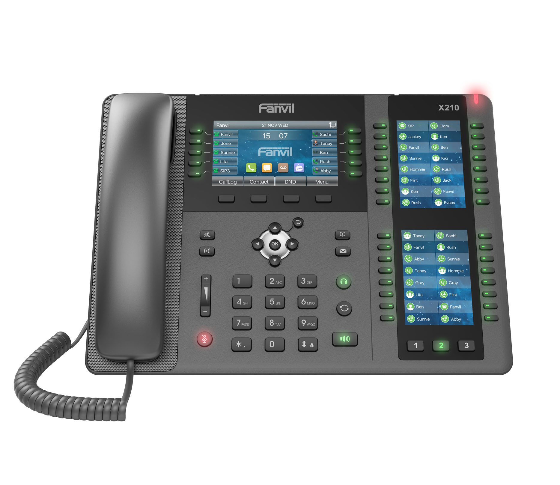 Das Fanvil X210 V2 ist ein Premium-IP-Telefon für Geschäftsprofis mit hohem Anrufaufkommen. Ausgestattet mit drei Farbdisplays (4,3\" Haupt- und zwei 3,5\" Seitendisplays) bietet es bis zu 106 DSS-Tasten und unterstützt 20 SIP-Leitungen. Dual-Gigabit-LAN mit PoE, integriertes Bluetooth 4.2 und USB-Port für WLAN-Dongle oder Aufzeichnung machen es zum vielseitigen Power-Phone :contentReference[oaicite:1]{index=1}.